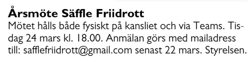 Årsmöte Säffle friidrott 24/3 kl 18.00